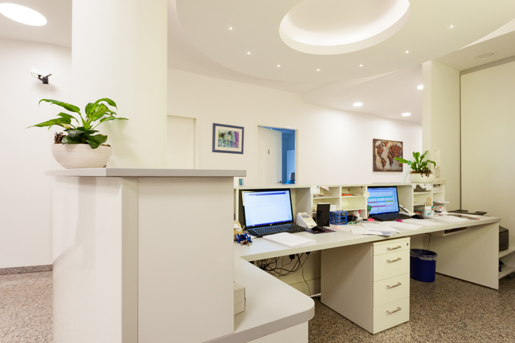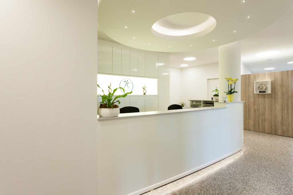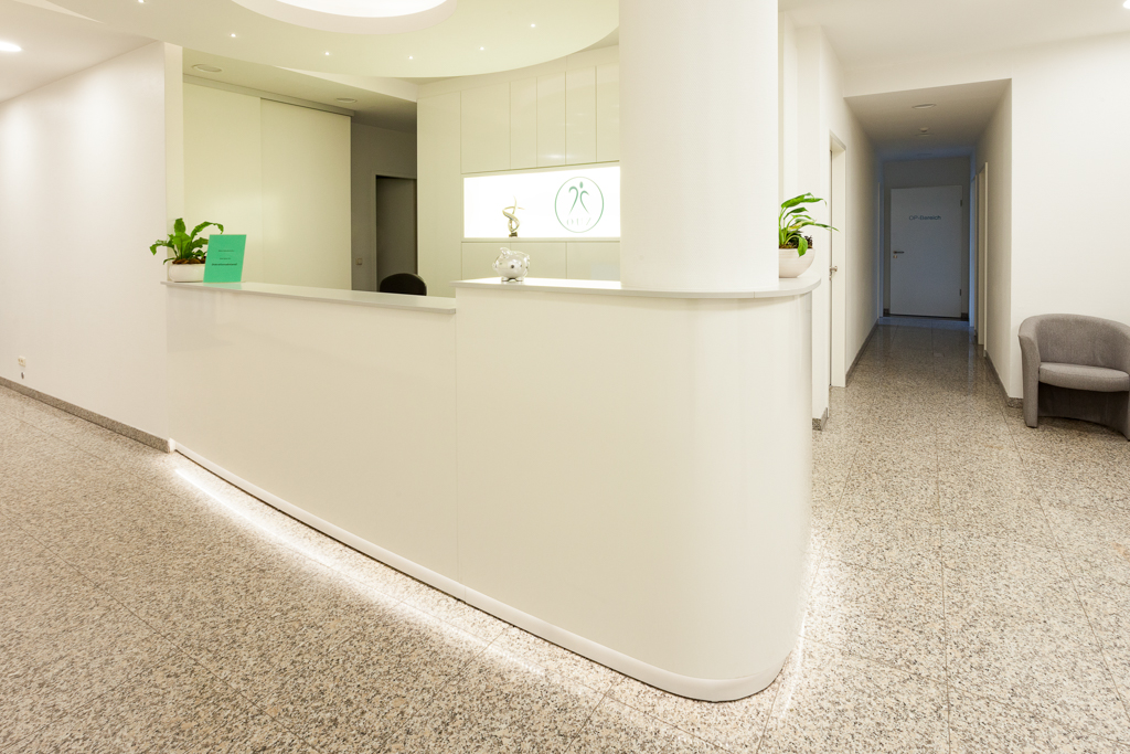 Referenz Allgemeinarztpraxis - Landsberger Allee - Dr. med. Tabari - leicht gebogener Tresen mit Pfeilerumbauung - Rückbuffet mit Logoeinfassung « zurück zur Übersicht